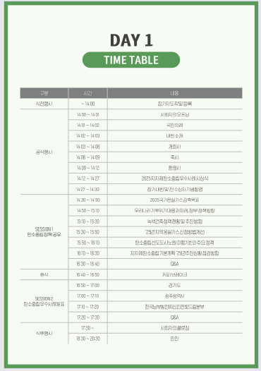 첫째 날 일정은 공식행사 → 세션 1(탄소중립 정책 공유) → 세션 2(탄소중립 우수사례 발표) 순으로 진행되었습니다.