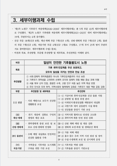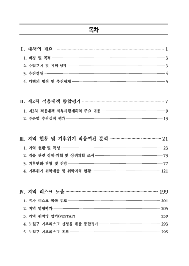 노원구의 지역 현황 및 기후변화 적응 여건, 기후변화 현황 및 전망, 취약성 평가 등 지역의 특성 을 고려하고, 전문가, 공무원, 구민들의 의견을 반영하여 건강, 재난·재해, 산림·생태계, 물관리 적응기반 등 5개 부문에 대한 기후위기 적응대책을 수립하였습니다.